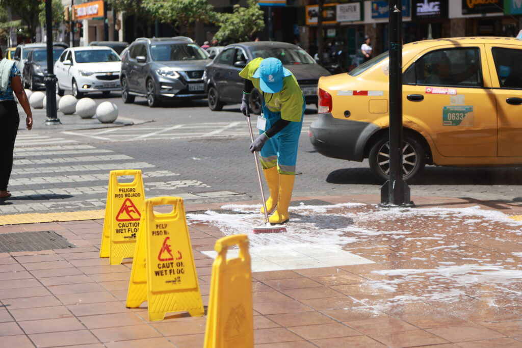 De forma paralela, se ejecutó el hidrolavado de los adoquines en las aceras de la avenida 9 de Octubre y Pedro Carbo, con la colocación de letreros informativos de precaución para preservar la seguridad de las personas que transitan diariamente por el bulevar mientras se desarrollaban las labores de limpieza.