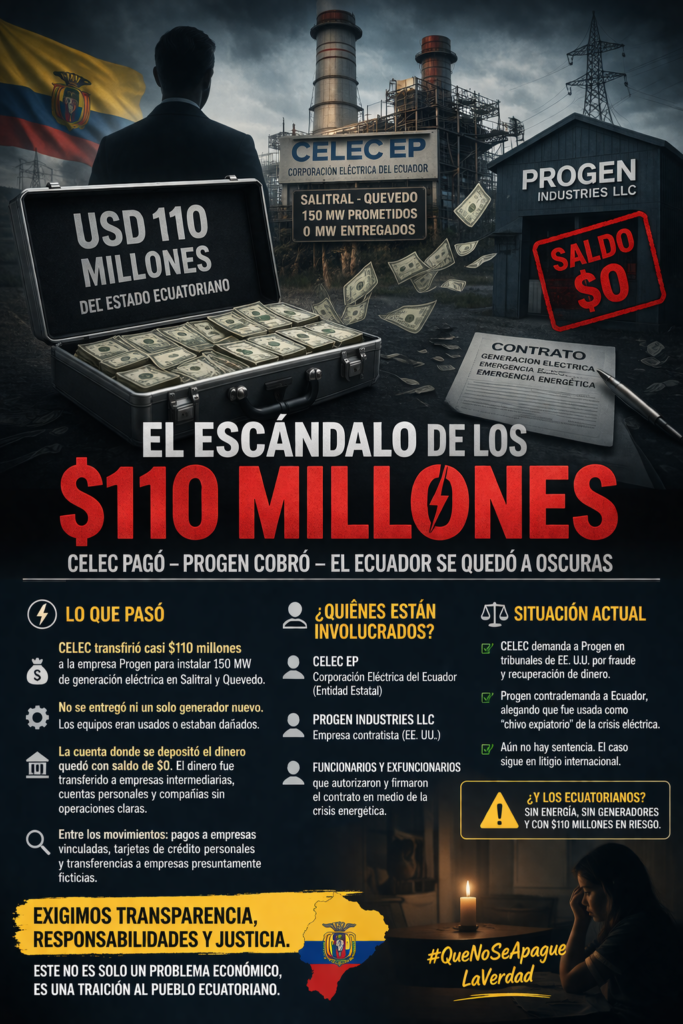 De acuerdo con CELEC, el dinero habría sido transferido hacia cuentas personales, familiares y empresas intermediarias, antes de que se garantice la operatividad de los generadores eléctricos contratados.
