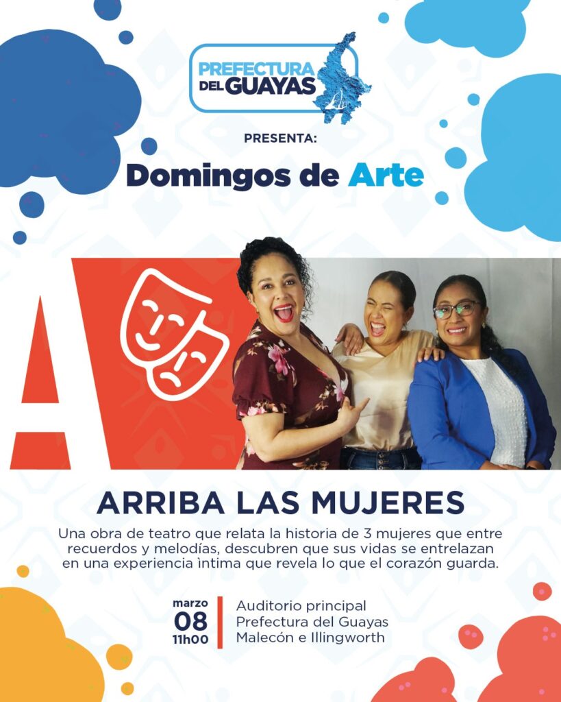 Por conmemorar del día internacional de la Mujer, la Prefectura del Guayas, liderada por la prefecta Marcela Aguiñaga, a través de la Dirección de Arte y Cultura, invita a la ciudadanía a disfrutar de una nueva jornada cultural de proyecto Domingos de Arte, que en esta ocasión presentará la obra teatral “Arriba las Mujeres”, una puesta en escena cargada de emoción, reflexión y humor.