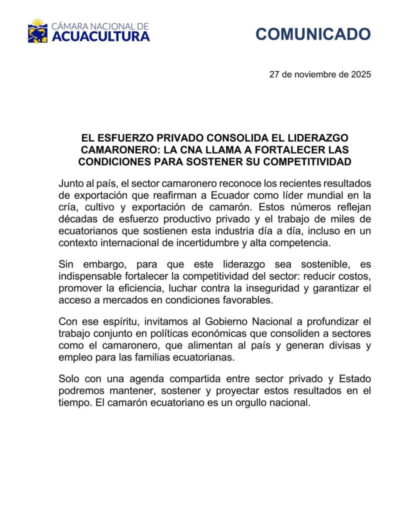 El gremio hizo un llamado al Gobierno Nacional para profundizar el trabajo conjunto en políticas económicas que fortalezcan a las industrias estratégicas, entre ellas la camaronera, que —según la CNA— “alimentan al país y aportan empleo y divisas a miles de familias ecuatorianas”.