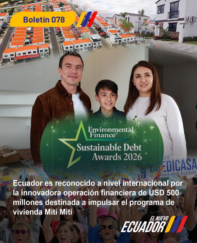 Ecuador ganó el premio “Social Loan of the Year” en los Sustainable Debt Awards 2026, organizado por Environmental Finance, en reconocimiento a una innovadora operación financiera por USD 500 millones destinada a impulsar el programa de vivienda de interés social y resiliente del país.