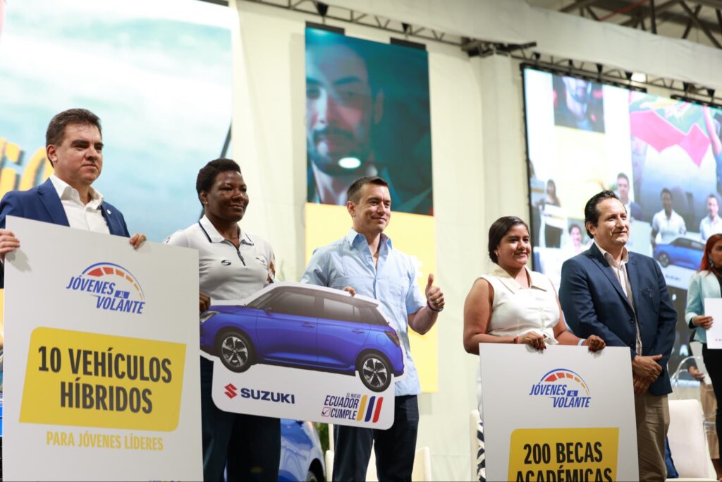 de la República, Daniel Noboa Azin, participó en el acto de entrega de becas, laptops y vehículos a jóvenes en situación de vulnerabilidad del Instituto Superior Tecnológico de Técnicas Empresariales y del Conocimiento (INTEC) y a deportistas de alto rendimiento. Estos recursos, valorados en USD$1.1 millones, provienen de una donación de SUZUKI Ecuador, como parte del compromiso suscrito ente Ecuador y Japón, en miras de promover el desarrollo del país.