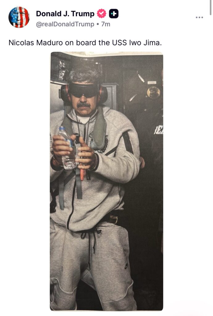 El mandatario estadounidense difundió en su red Truth Social la imagen acompañada del mensaje “Nicolás Maduro a bordo del USS Iwo Jima”, tras una operación militar estadounidense en Venezuela que culminó con la detención de Maduro y su esposa, Cilia Flores, quienes serán trasladados a Nueva York para enfrentar cargos federales por narcoterrorismo, conspiración para importar cocaína y otros delitos imputados por el Departamento de Justicia de EE. UU.